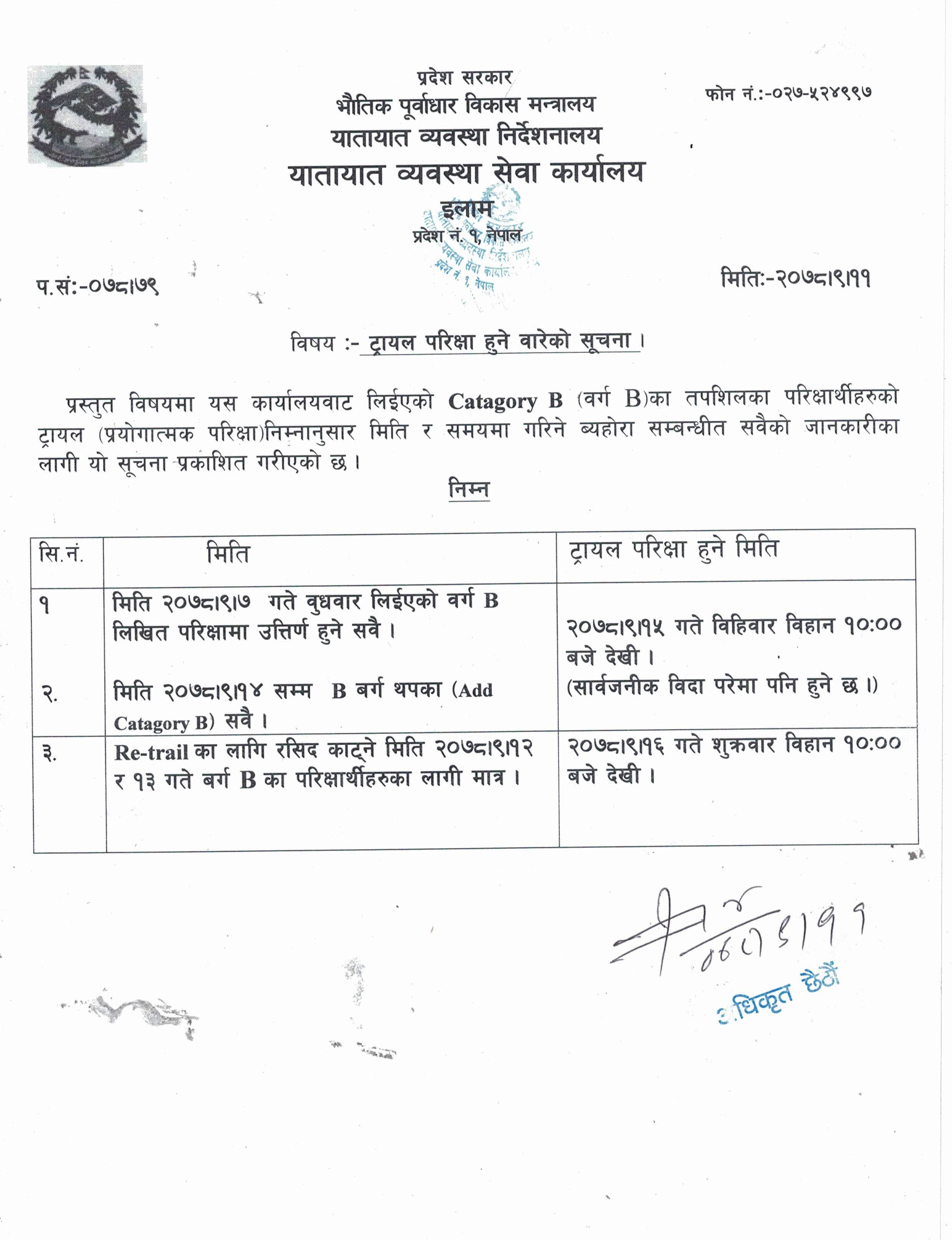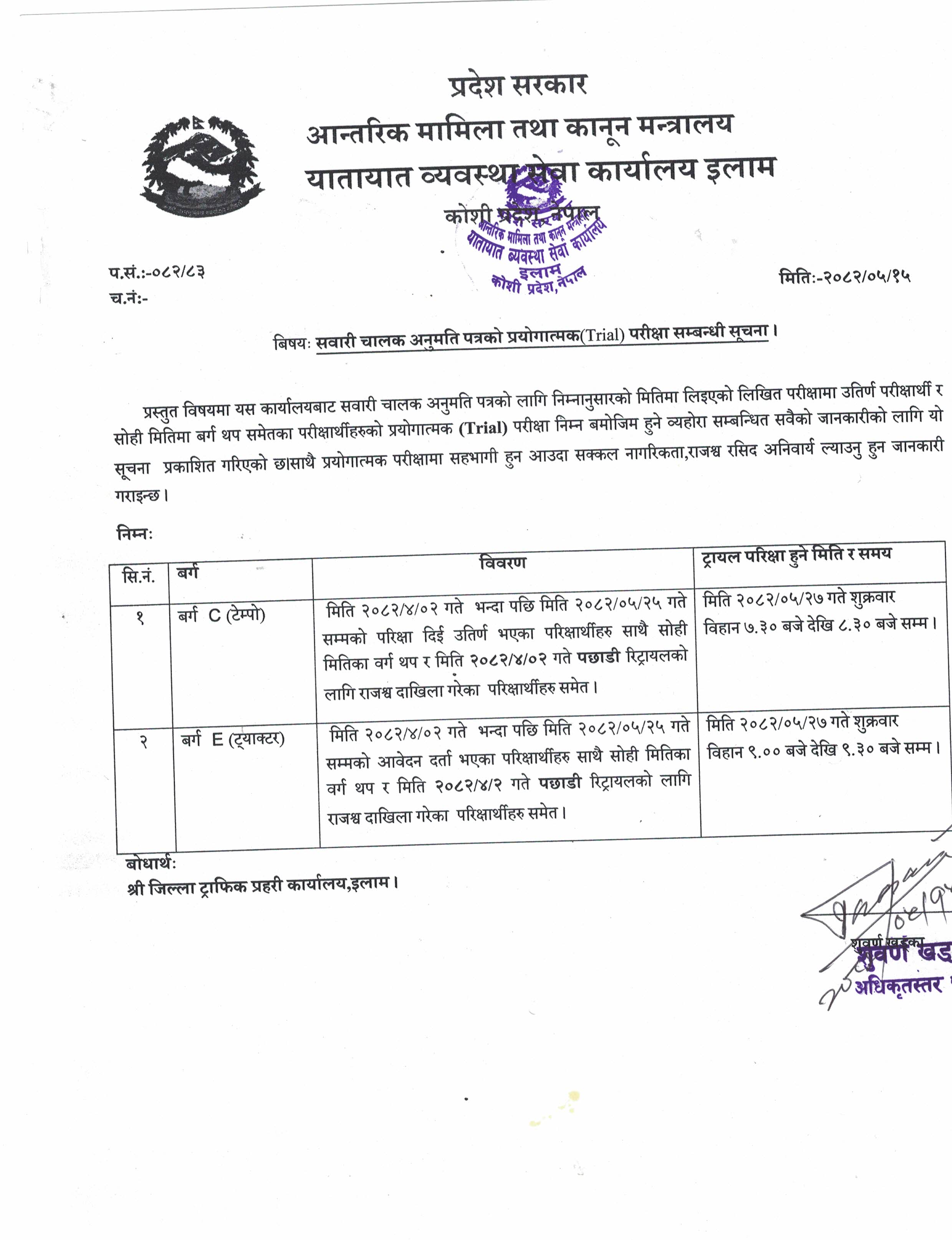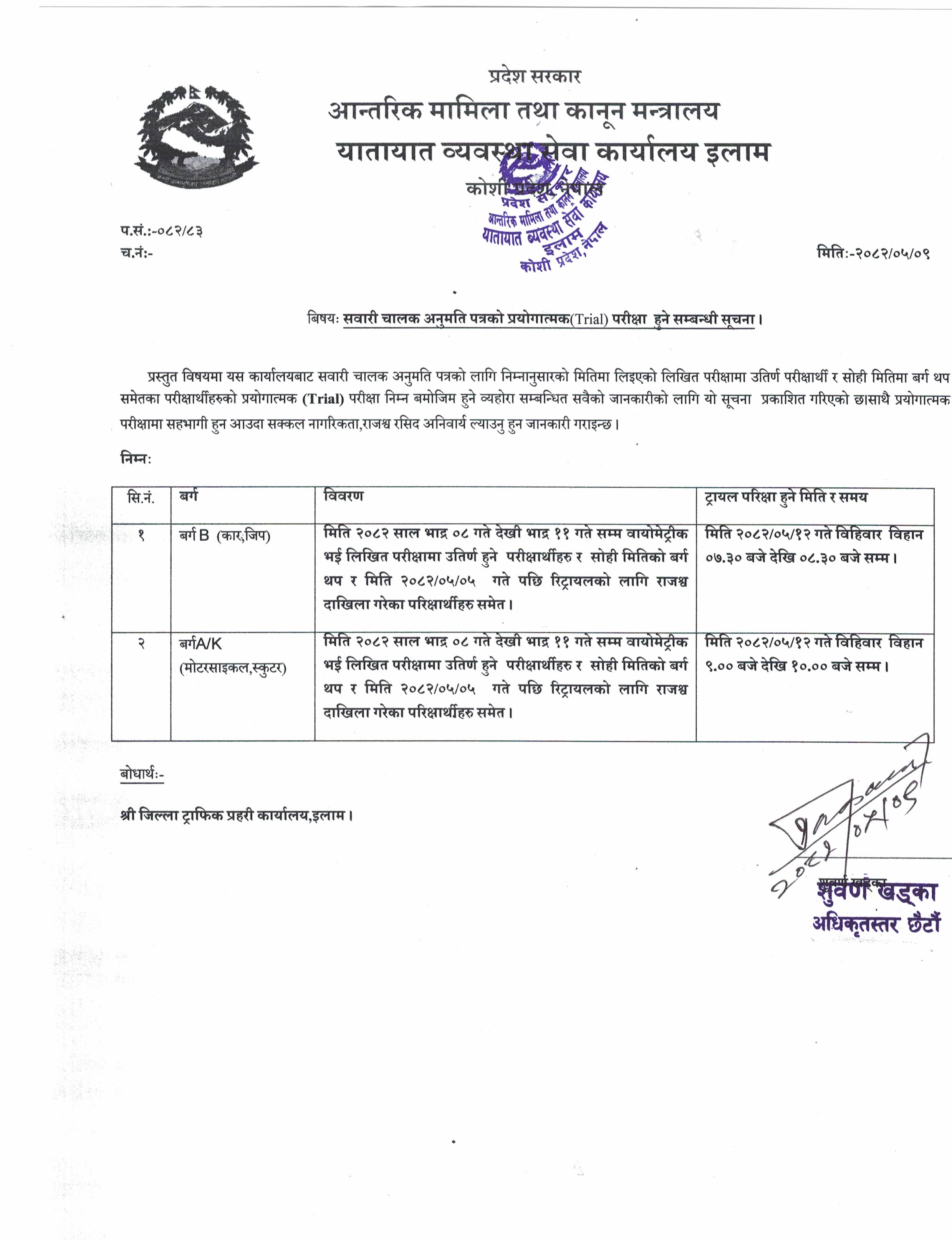 >> मिति २०७८।०८।२६ र २७ गते वर्ग A र K (मोटर साइकल र स्कुटर) को ट्रायल परीक्षा यहि मिति २०७८।०९।०४ गते आइतवार १०:०० बजे देखि हुने व्यहोरा अनुरोध छ ।